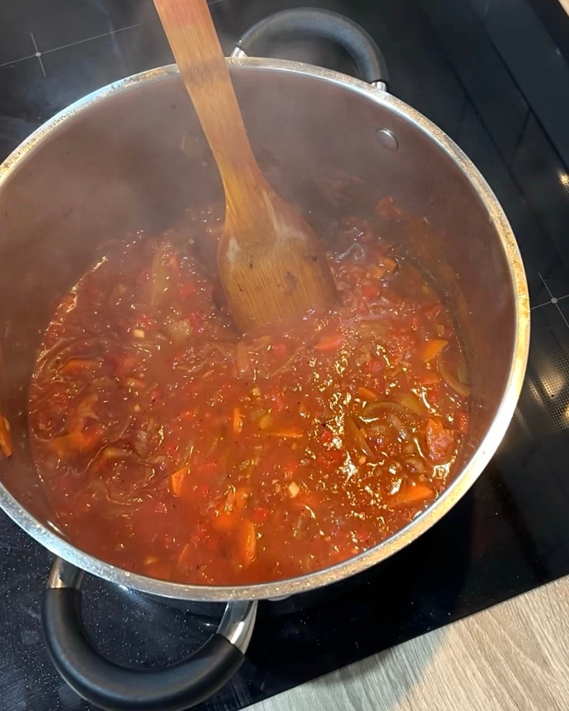 5. Add the tomato puree to the pot and cook that out for a couple of minutes before adding Worcestershire sauce, tinned tomatoes, red wine stock cube and vegetable stock (in 250ml water). Stir well and bring to a gentle simmer.