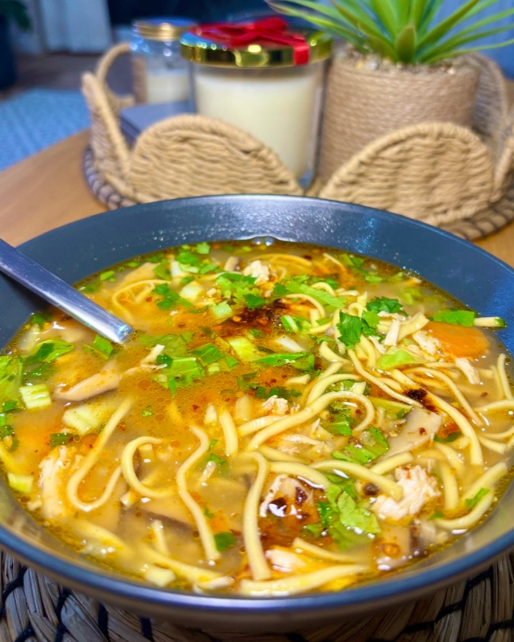 - Add the egg noodles to the soup and cook according to packet instructions (usually 3–4 minutes).