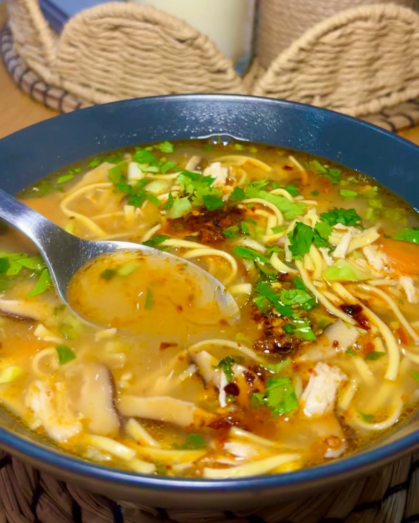 - Ladle into bowls and finish with extra chilli oil if you like a bit more heat, coriander, and sesame seeds.
