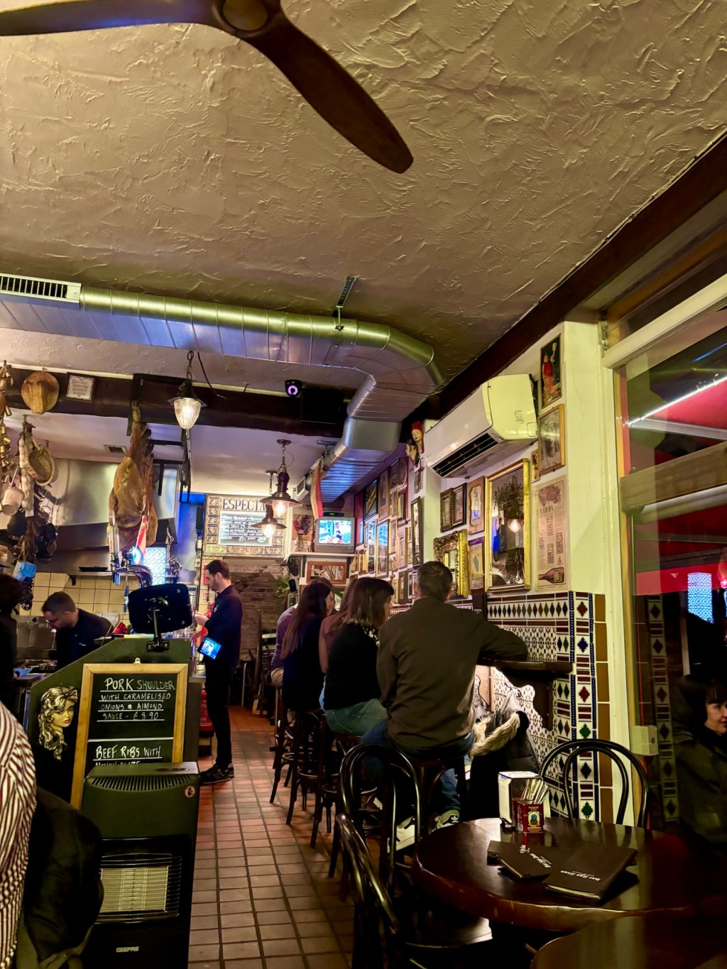 The walls boasted traditional Spanish tiles, a mix of frames and artwork, and the best thing was fresh legs of jamón hanging from the ceiling by the kitchen – a clear indication of the fresh and authentic produce used to curate such delicious, traditional dishes.